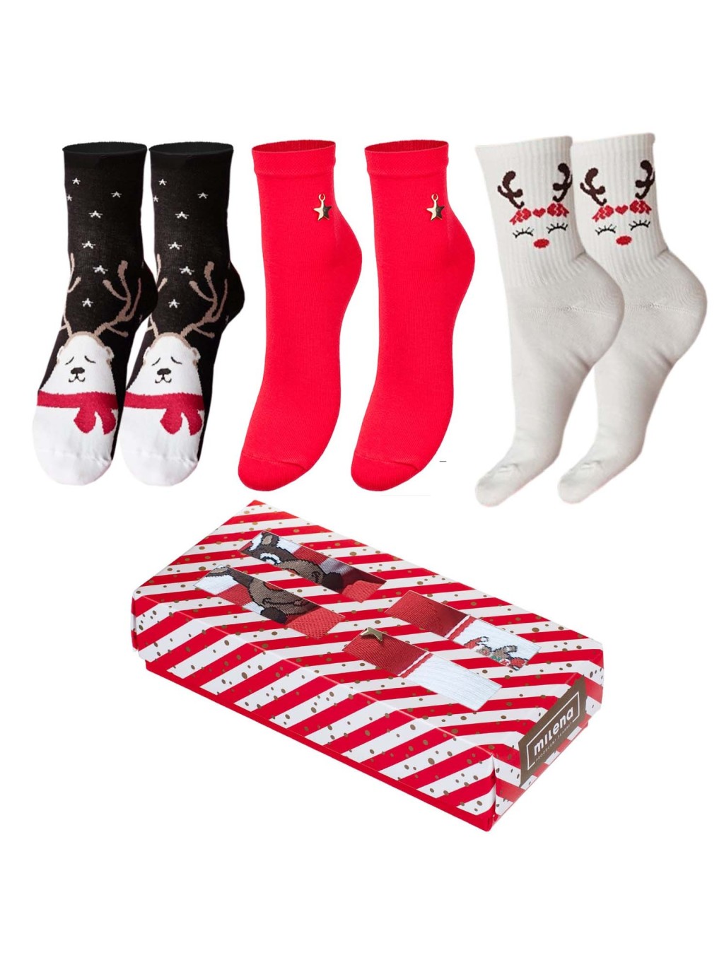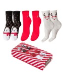 The women’s festive set features 3 pairs of Christmas socks, thoughtfully packed in an elegant windowed cardboard box just for you. Inside, you’ll find two pairs with joyful holiday patterns and one sleek pair adorned with a charming star — perfect for adding a touch of festive spirit to any outfit.