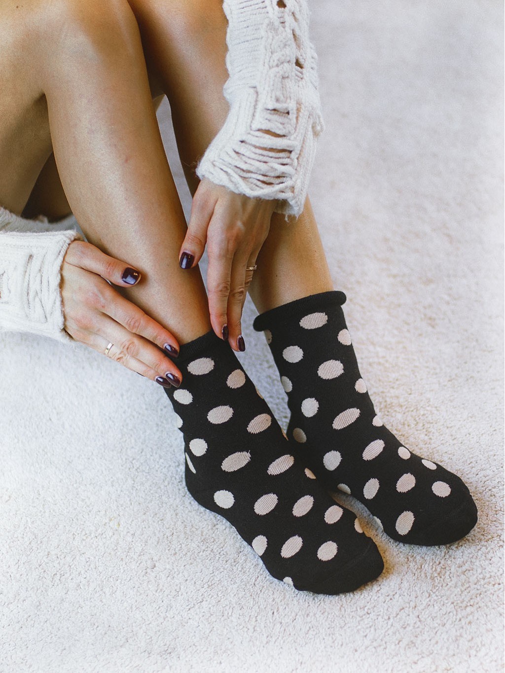 Nasze ciepłe skarpety z bezuciskowym wykończeniem ze wzorkiem grochów. Postaraliśmy się o różnorodność co do wyboru wariantów kolorystycznych naszych skarpet, więc mamy nadzieję, że znajdą one miejsce w Waszej kolekcji i zagoszczą tam na długo 👀 Wysoka jakość wykonania gwarantuje komfort użytkowania dla każdego ich posiadacza.