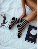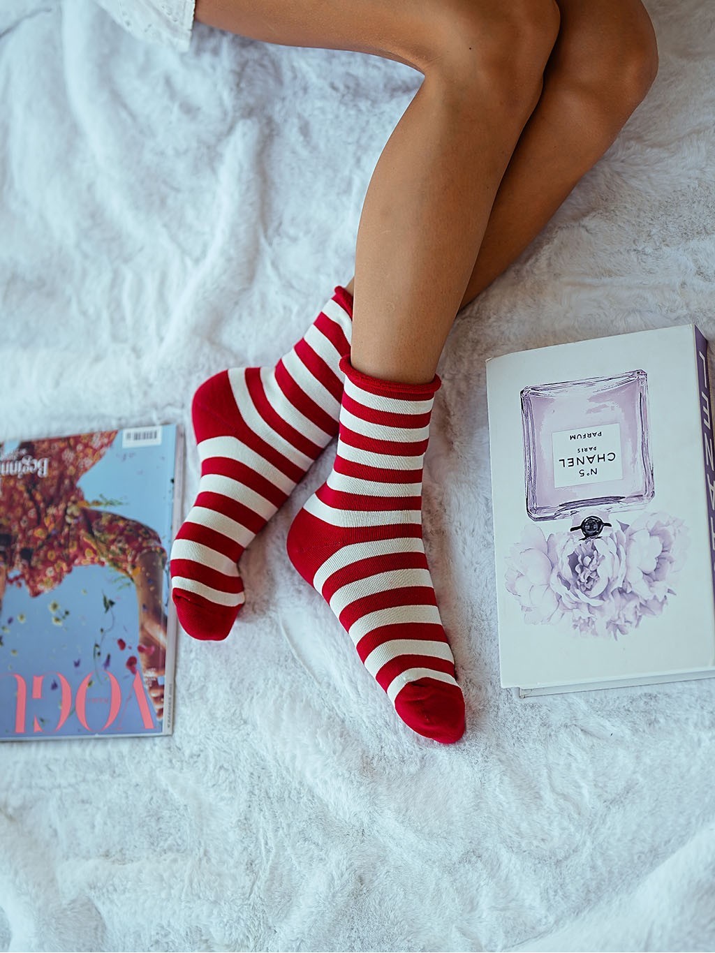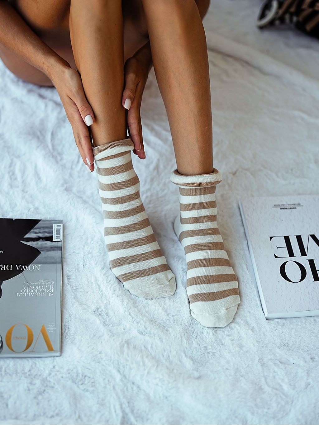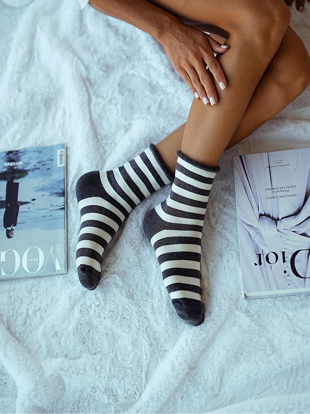 Wywijany ściągacz pozwala odetchnąć nieco nodze, jednocześnie nie uciskając jej i zapewniając pełną swobodę ruchu. Pasy na skarpetkach pozwalają poczuć nieco klasyki płynącej z samego wzoru, dodatkowo stając się idealnym dodatkiem do niejednej stylizacji.