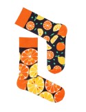 Ależ się na nich dzieje! Cytryny oraz pomarańcze, czyli chodzące (może nie do końca) źródła witaminy C już na naszych skarpetkach! Jest jeden z kolejnych mocno wyróżniających się wzorów na tle innych szarych skarpetek, który na pewno warto rozważyć.