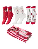 Zestaw świąteczny damski to 3 pary skarpetek świątecznych damskich. Oczywiście specjalnie dla Was zapakowaliśmy je w estetyczne kartonowe pudełko z okienkiem. W zestawie znajdują się dwie pary skarpetek w wesoły, świąteczny wzór oraz jedna gładka z ozdobną złotą gwiazdką.