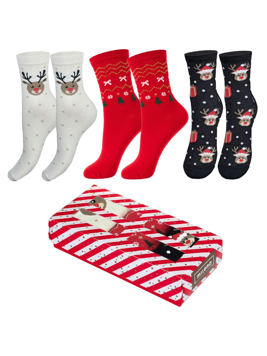 Zestaw świąteczny damski to 3 pary skarpetek świątecznych damskich. Oczywiście specjalnie dla Was zapakowaliśmy je w estetyczne kartonowe pudełko z okienkiem. W zestawie znajdują się dwie pary skarpetek w wesoły, świąteczny wzór oraz jedna gładka z ozdobną złotą gwiazdką.