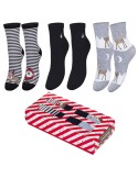 Zestaw świąteczny damski to 3 pary skarpetek świątecznych damskich. Oczywiście specjalnie dla Was zapakowaliśmy je w estetyczne kartonowe pudełko z okienkiem. W zestawie znajdują się dwie pary skarpetek w wesoły, świąteczny wzór oraz jedna gładka z ozdobną złotą gwiazdką.